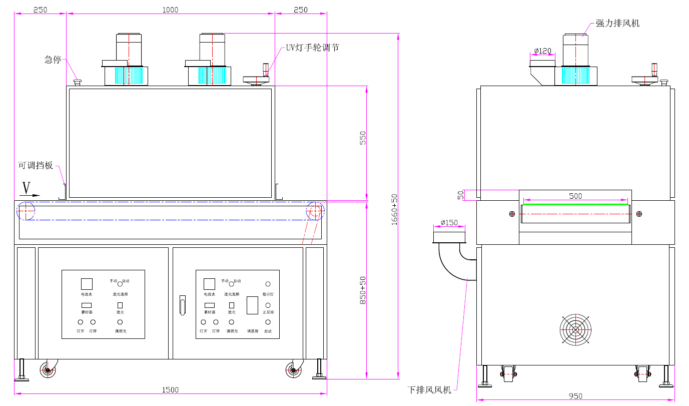 | 1、UV燈功率:3kw*2支(汞燈) | 2、UV燈總長:620mm、弧長:500mm |