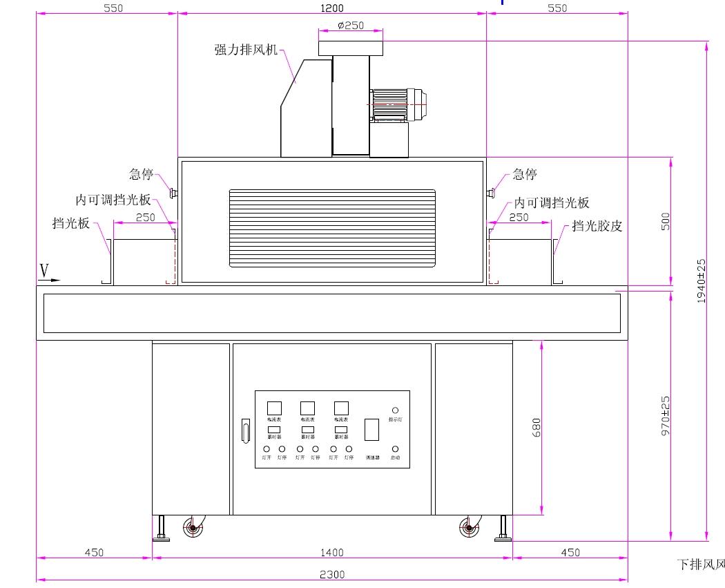 | 一、UV燈功率:3.0kw*3支(UV汞燈) | 二、UV燈總長:500mm,弧長:400mm |